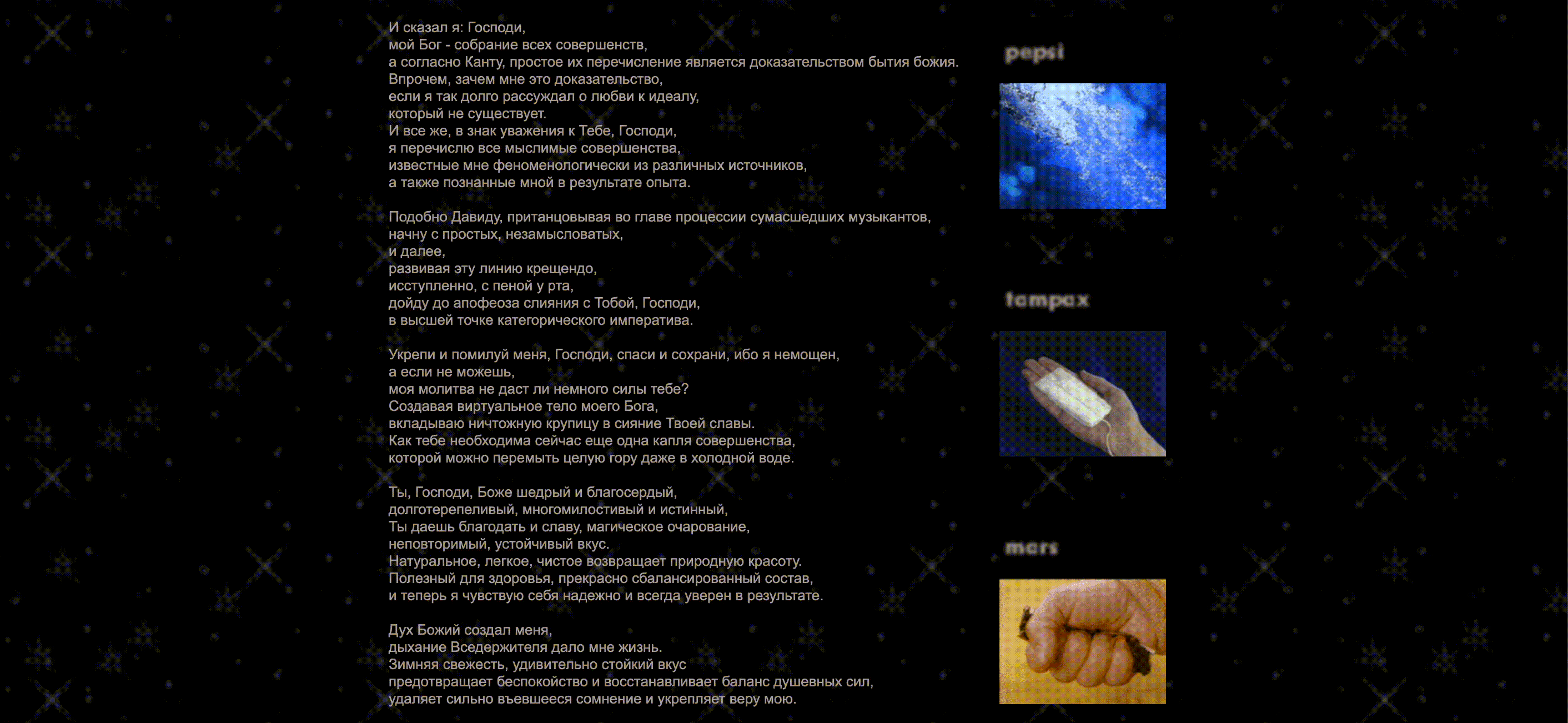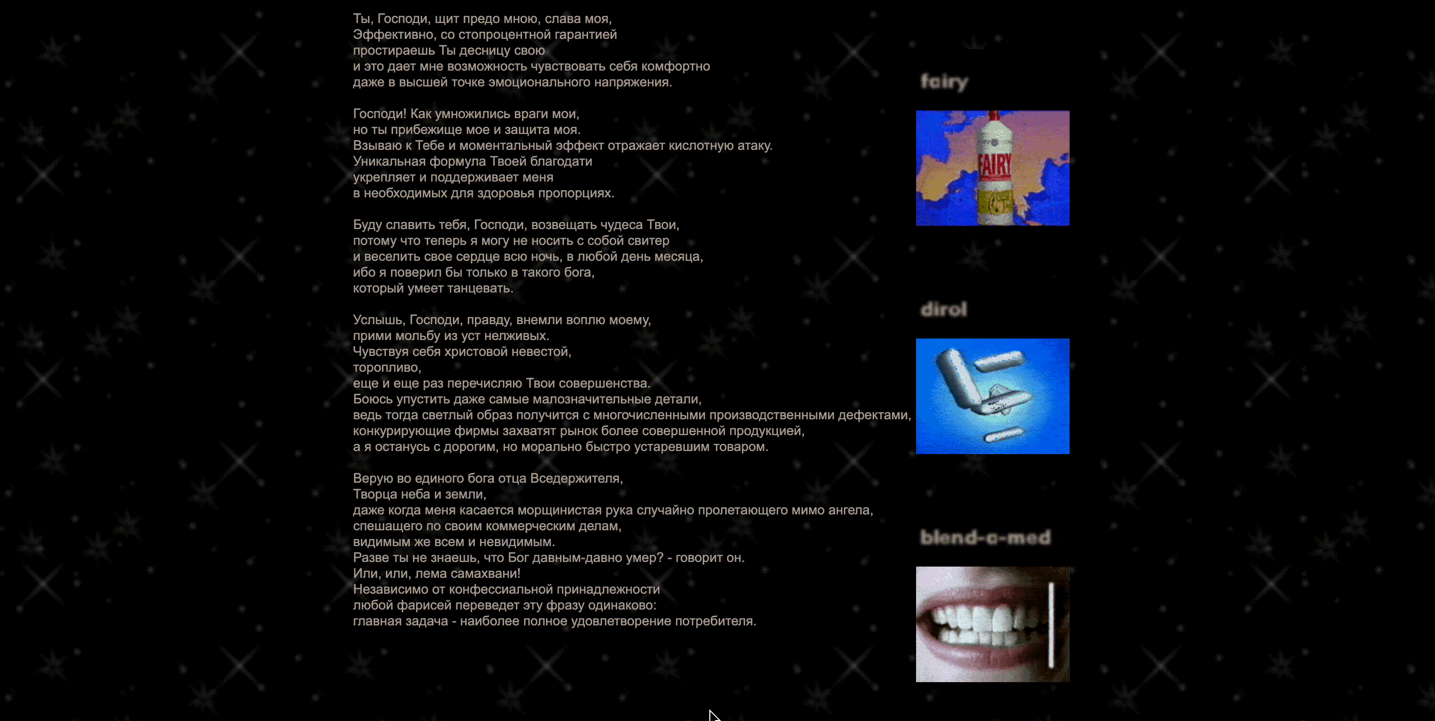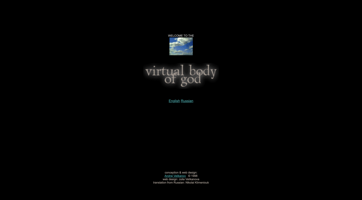 Проект «Виртуальное тело Бога» (1998, гран-при Art on the Net), ставший знаковым явлением российского net-art, представляет собой гипертекстовую интерфейсную инсталляцию, где происходит радикальное столкновение сакральных текстов (Псалтырь, Символ веры) с визуальным языком рекламных GIF-изображений. Великанов конструирует сложную семиотическую карту, в которой фрагменты, ассоциирующиеся с телом, машиной и сакральным, образуют единое медийное пространство, превращая HTML-страницу в поле философского эксперимента.