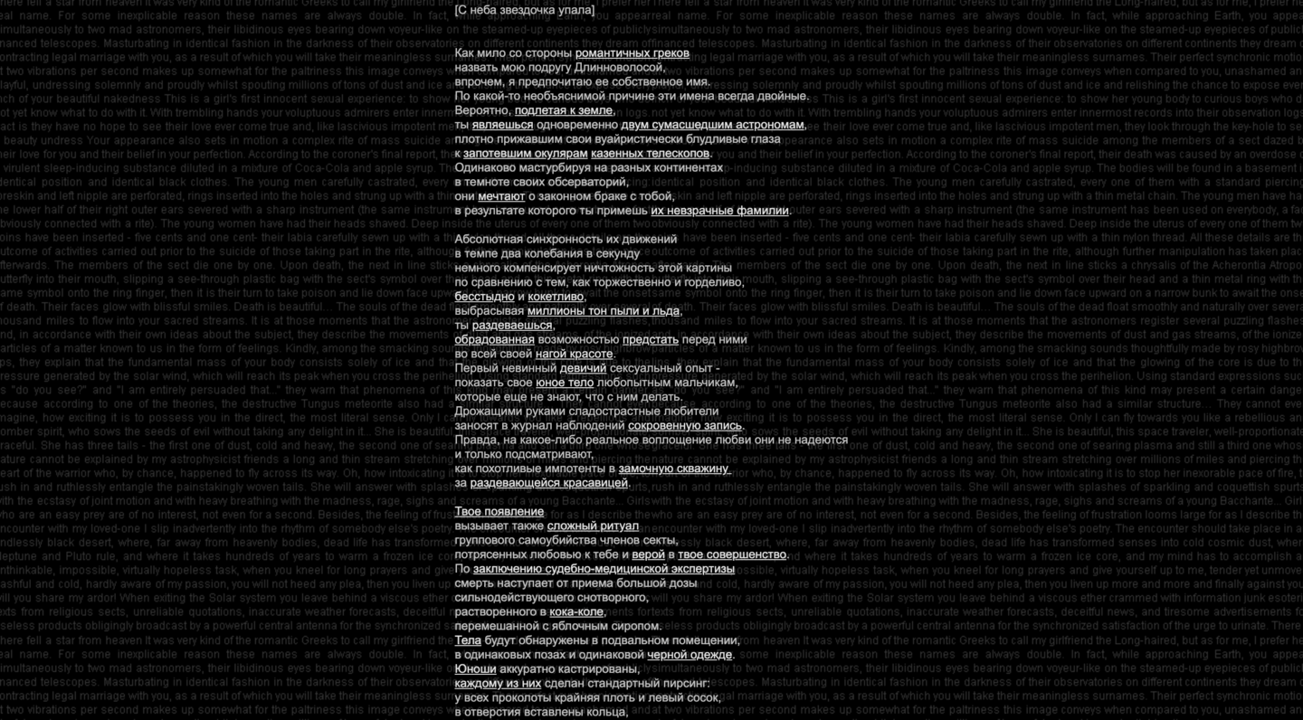 Фреймы, гиперссылки и анимированные GIF-изображения выполняют не просто демонстративную функцию, но формируют монтажную структуру, аналогичную кинематографической, однако с принципиальным отличием — нелинейной организацией. Взаимодействуя с элементами интерфейса, пользователь раскрывает историю в произвольном порядке, создавая индивидуальную траекторию восприятия.