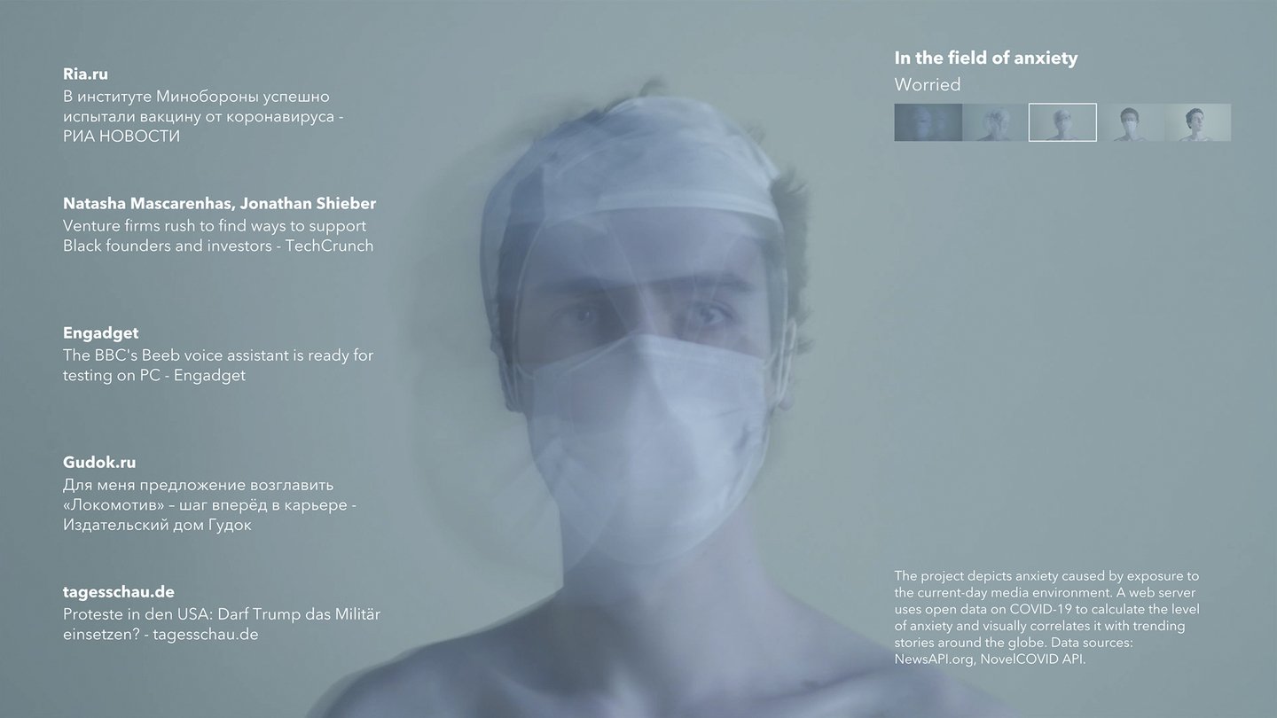 «In the field of anxiety» — интерактивная инсталляция, визуализирующая уровень массовой тревожности через поток новостей и данные о пандемии. В реальном времени система генерирует навязчивую последовательность изображений людей в масках — чем выше уровень паники в медиа, тем интенсивнее мерцают кадры. Проект превращает абстрактную статистику в эмоциональный опыт, обнажая механизмы формирования коллективной паранойи в цифровую эпоху.Это ещё один пример сдвига от интерфейса к алгоритмически сгенерированной цифровой среде.