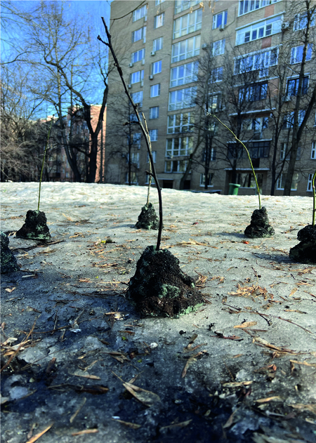 Кинетическая инсталляция «Природный баланс» представляет собой серию из 6 объектов, выставленных в круг. Каждый объект составляет каменно-глиняное основание, вращающийся элемент и палочка. В глину встроен мотор и батарейка, палочка прикреплена к крутящемуся элементу.