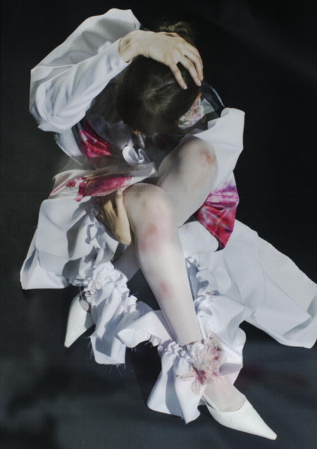 Находясь в поисках ассоциаций к цвету viva magenta я вспомнила о свадебном образе моей мамы: фата, перчатки и лепестки роз на подоле её платья были красно-розового цвета. Этот цвет фигурирует в отношениях моих родителей, превращаясь из свадебной влюблённой истории в историю о кровавых побоях и насилии. Мой проект освещает проблему домашнего насилия, создавая метафору нежного хрупкого цветка — женского образа, который измученно покрывается синяками.