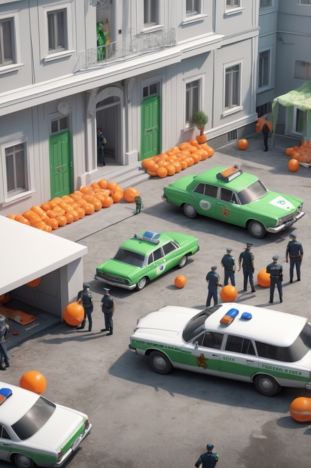 «white Russian police cars crowded under the entrance of a gray panel soviet house. next to the policeman in the foreground depicted multiple oranges and light green blocks».
