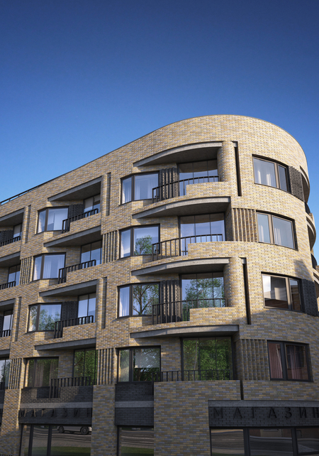 Среднеэтажный многоквартирный жилой дом со встроенно-пристроенными помещениями и подземным паркингом по адресу: г. Санкт-Петербург, Волковский пр., дом 6, литера Ж. Облик здания обусловлен особенностями функционального назначения и решен в композиционном, цветовом и фактурном сочетании объемов и примененных в оформлении фасадов конструкций. Материал фасадов — кирпич керамический
