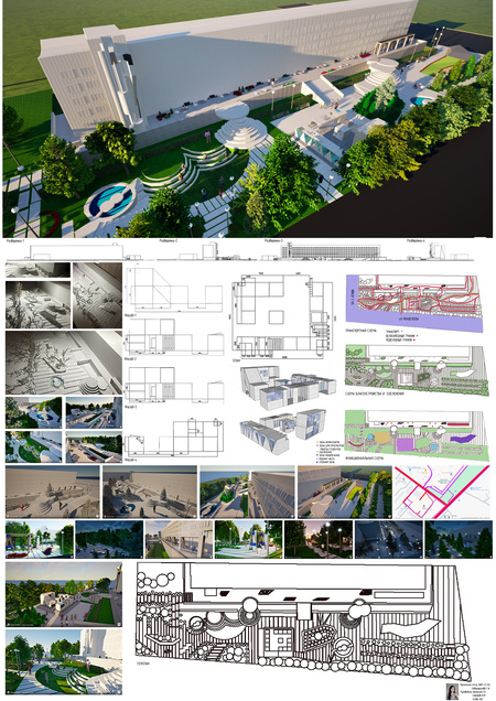 На территории Архитектурно-строительного института главным объектом является павильон предназначенный для просмотров курсовых и дипломных работ архитекторов. Недалеко от павильона расположен амфитеатр, где можно проводить лекции в осенне-весенний период. Рядом находится один из водоемов, чтобы студенты могли расслабиться и немного отдохнуть от учебы. В теплую погоду можно позаниматься учебой и на стилобате за столиками, там же расположены и качели где студенты и не только смогут морально отдохнуть. Тщательно изучив методы проектирования общественно-уличных и парковых зон, я приступила к эскизированию. Выявив концепцию своего благоустройства, я перешла к макетированию и проработки генплана.