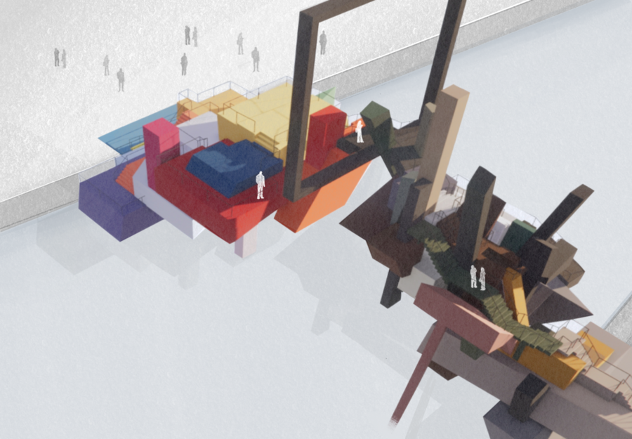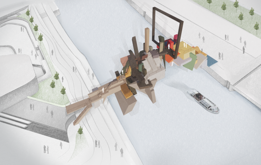 АРТ-ОБЪЕКТ ОТОБРАЖАЕТ ДВА ПЕРИОДА ЖИЗНИ И ТВОРЧЕСТВА ХУДОЖНИКА. В НЕМ СИМВОЛИЧНО ОКНО КАК ОБРАЗ НОВОГО ЭТАПА В ЖИЗНИ И РАСПОЛОЖЕНИЕ НАД РЕКОЙ, СИМВОЛИЗИРУЮЩЕЙ ТЕЧЕНИЕ ЖИЗНИ