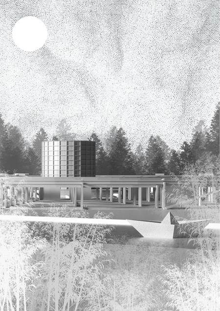в центре ТВЦ (торговли вечными ценностями) расположено цилиндрическое здание — заключительный этап проектного нарратива; точка притяжения, отражающая истины. вокруг здания расположено озеро С-образной формы, по которому можно прогуляться по камням.