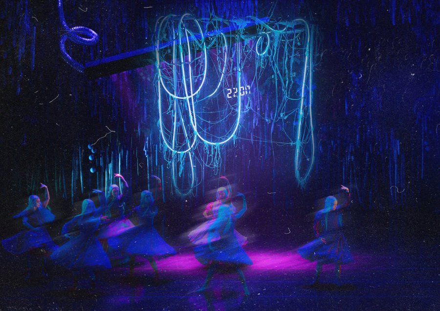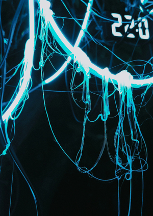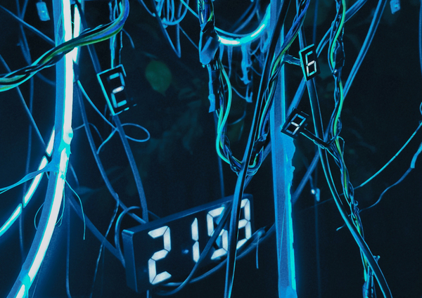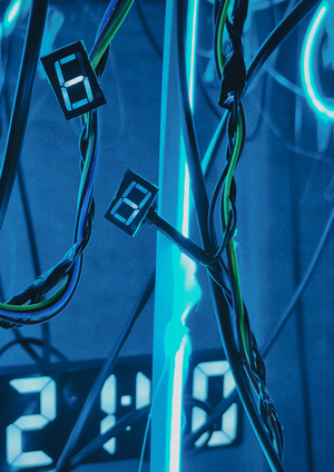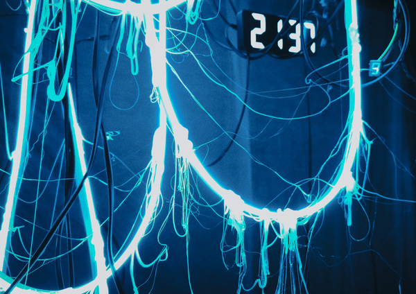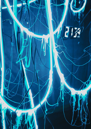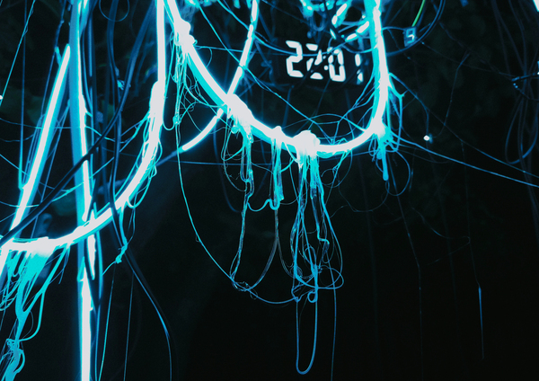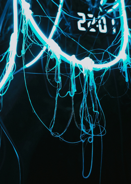 Арт-объект представляет собой овальное кольцо, с которого свисают провода и LED лента с тягучими каплями. К проводам прикреплены небольшого размера индикаторы от цифровых часов с разными цифрами, стекающими вниз. Сердце арт-объекта — большие электронные часы.