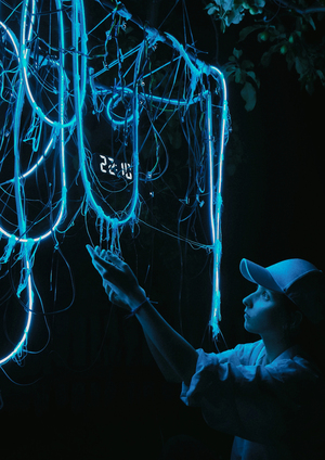 Объект визуализирует время как текучую, субстанцию. Основа конструкции — хаотичные черные провода, к которым прикреплены миниатюрные цифровые индикаторы. По ним струится LED-лента, создающая иллюзию капель. В центре композиции расположены электронные часы, которые являются сердцем арт-объекта.
