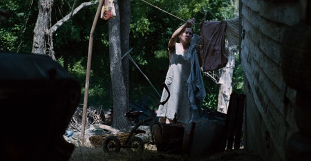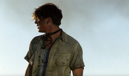 Сцена из того же «Перл-Харбора» только теперь ситуация трагичная, а герой измотан. Опять встречается запачканная армейская майка, пятна пота и воды на ней. При таком освещении белый предмет одежды становится голубого оттенка и психологически отсылает к печальной атмосфере. Эмоции в отличие от предыдущих примеров у зрителя иные, потому что дизайнер по костюму стремится передать ощущение потери, опустошения и страха войны. Персонаж здесь не сильный и всемогущий рыцарь, а уставший и подавленный воин.
