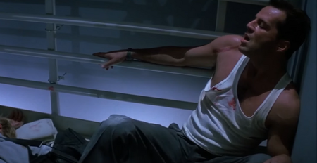 Начать можно с фильма «Крепкий орешек», где главный герой Маклейн на протяжении всего фильма носит одну и ту же майку. Она вместе с ним переживает все испытания и хорошо отражает путь персонажа. Все начинается с белоснежно-белой майки, которая в последствии оказывается запятнана кровью. Практически каждую минуту на ней появляется все больше повреждений. После нахождения героя в вентиляционной трубе, майка и вовсе становится грязно-зеленого цвета.