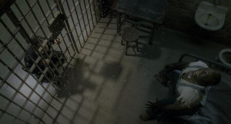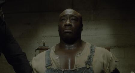 Образ Джона в целом — игра контрастов. Несмотря на массивность самого актера, комбинезон на нем немного потрепанный и выдает в образе некую доброту и скромность. Это вызывает диссонанс в глазах зрителя — как в одном человеке сочетаются разные вещи. Пока героя ведут на казнь, зритель может рассмотреть не только грязь и потертости. Рукава футболки оторваны, пуговицы расстегнуты, создается ощущение, будто персонажу тесно в этом и не хватает воздуха. Ко всему, на теле Джона появляется пот, выдающий его тревожное состояние перед смертью, поэтому футболка еще и прилипает к телу. Вся сцена вызывает дискомфорт, а костюм только усиливает это ощущение давления и тревоги.