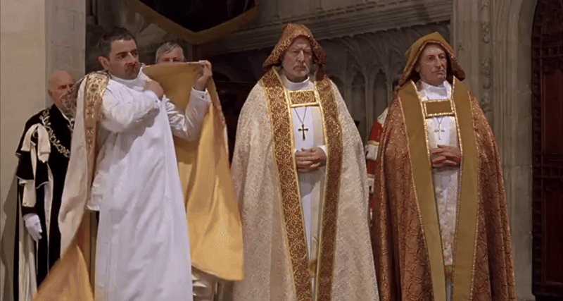 Вот еще пример, когда одежда главного героя полностью выбивается из окружающей его среды. Агент Джонни оказывается в храме, где казалось бы должна сохраняться атмосфера чистоты, только вот персонаж появляется в грязном и помятом костюме из канализации. Ощущение несоответствия — это одна из самых распространенных причин для возникновения смеха, поэтому такой ход хорош для комедий.