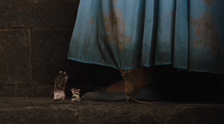 После бала героиня сидит за одним столом с ее семьей, однако порванное и грязное платье указывает зрителю на резкое различие их статуса. Золушка не наравне с ее сестрами, ведь ее можно назвать прислугой в их доме. Кстати здесь есть место и приему контраста из прошлой главы, потому что от противопоставления появляется ощущение легкой иронии над сестрами и мачехой, ведь они выглядят слишком напыщенно.