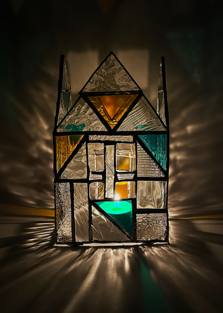 Вторая работа представляет собой фонарик в виде маленьких домиков с окошками и дверьми, благодаря прозрачному материалу и не навязчивой палитре, фонарик передает тепло и уют, навевая воспоминания о детстве.