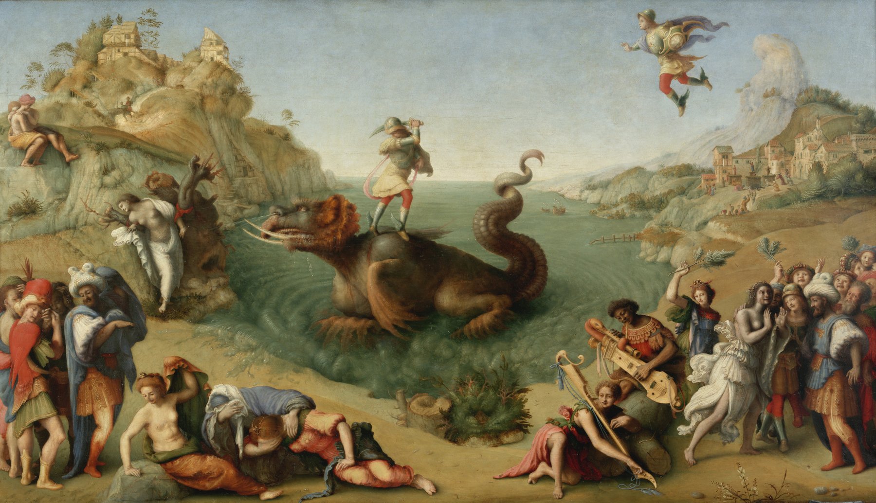Картина «Персей и Андромеда» была написана флорентийским живописцем Пьеро ди Козимо в 1510–1515 годах и является великолепной моделью итальянского Ренессанса, наполненной мифологическим драматизмом и чувственностью. Художник изображает момент освобождения Андромеды от морского чудовища Персеем, подчеркивая героизм, страх и катарсис спасения. Композиция насыщена динамикой, цветовой контраст усиливает напряженность сцены, а детализированная прорисовка персонажей и пейзажа передает дух эпохи и личный стиль Козимо, сочетающий традиции флорентийской школы с экспериментальной живописью.