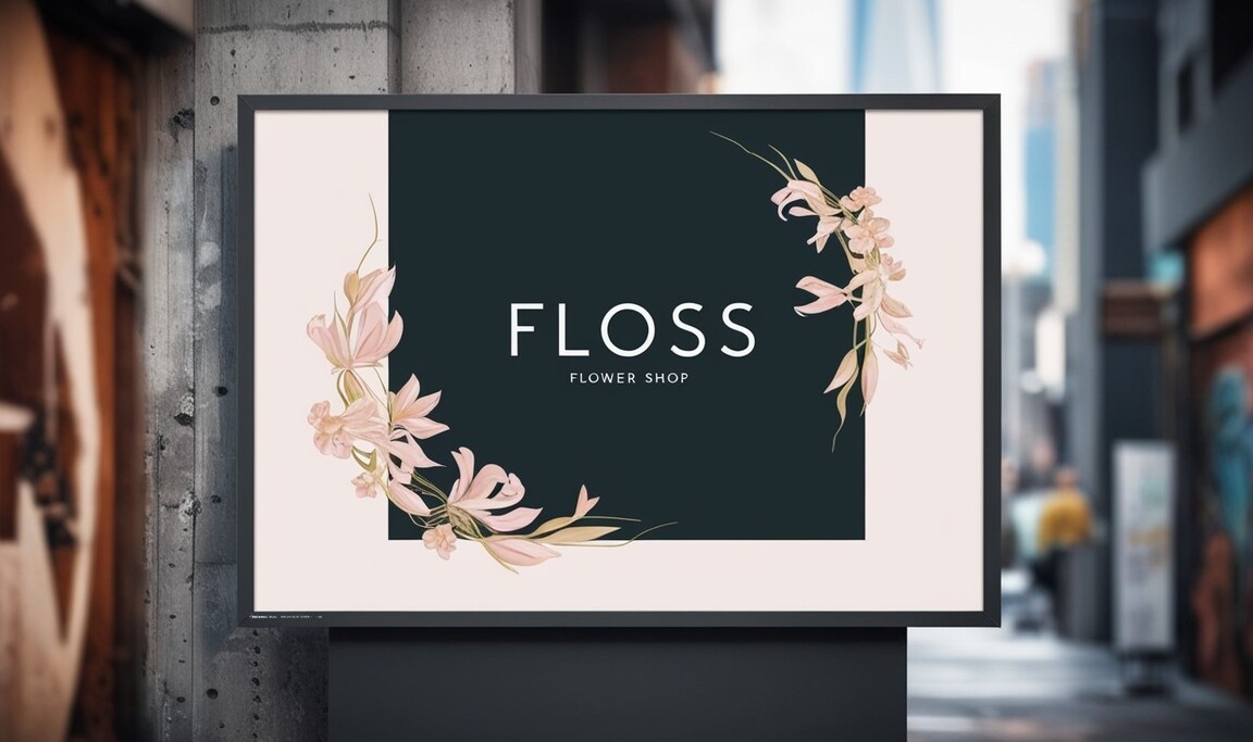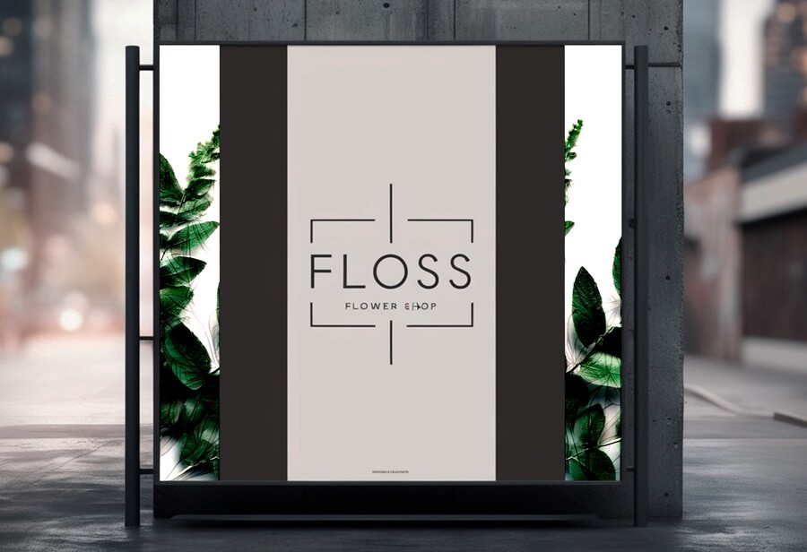 prompt: generate a mockup of minimalistic poster for the ’FLOSS’ flower shop area in the urban environment on billboard. The background is urban.