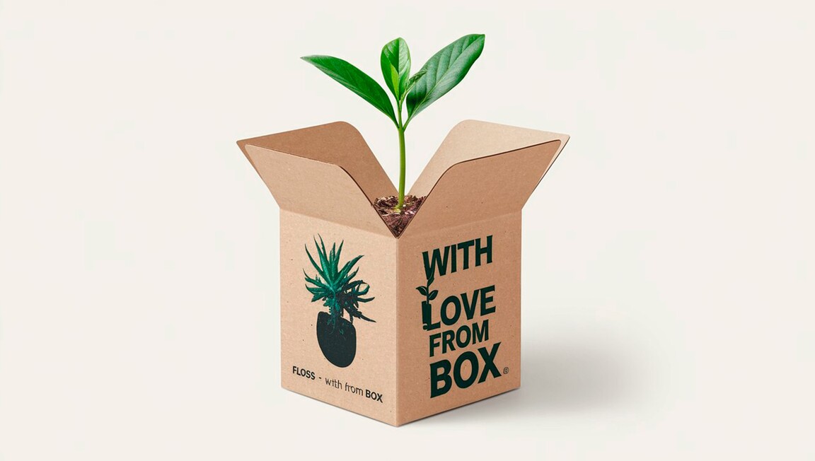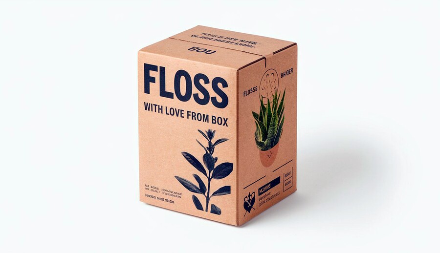 prompt: create a box for plant seeds from kraft paper. There is an image of a plant on the package. The box has 'FLOSS — with love from box' written on it in minimalistic font. A box on a white background.
