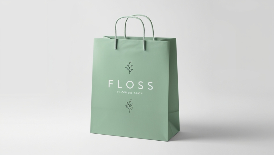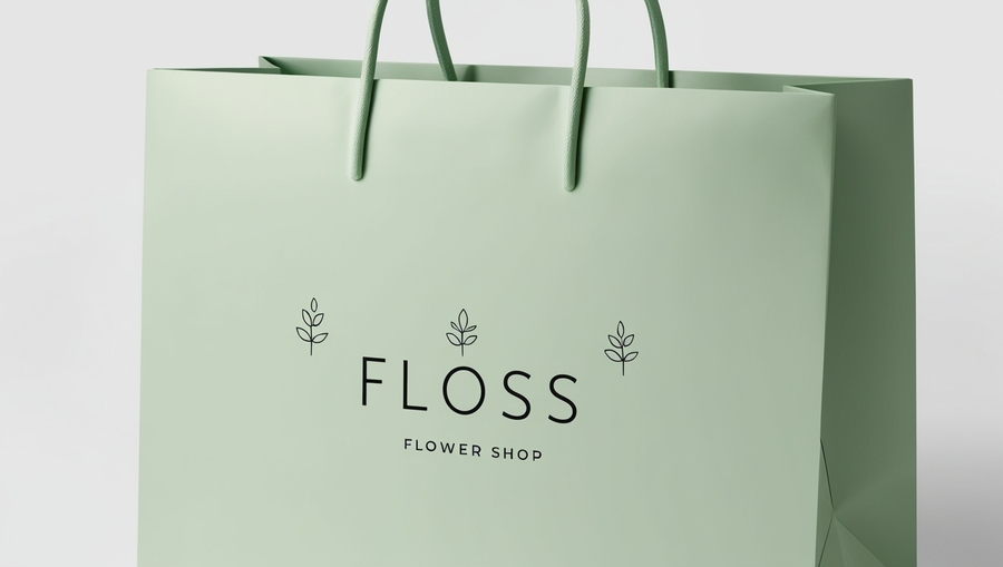 prompt: create a mockup of a shopping bag for the flower shop 'FLOSS'. Depict minimalistic small leaves and write in minimalistic font 'FLOSS' on the shopping bag. The shopping bag is light green in color. The background is white.