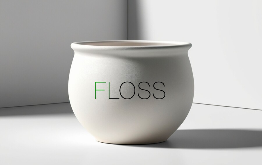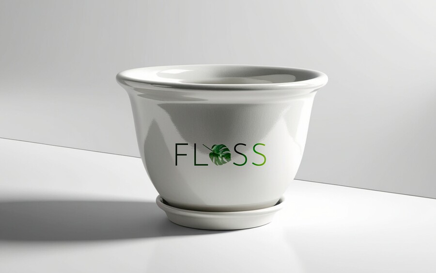 prompt: create a flower pot mockup for the flower shop of the brand ’FLOSS’. Write ’FLOSS’ in green color and in a minimalistic sans-serif font on this. Add a small leaf. The pot is white. The background is white.