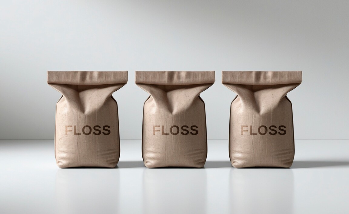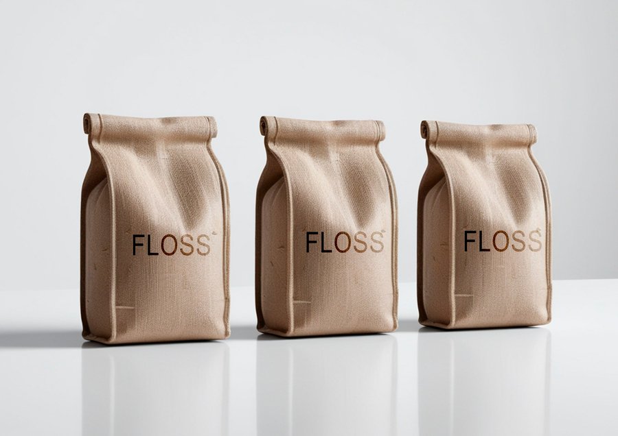 prompt: create a packaging mockup for the flower shop of the brand 'FLOSS'. Write 'FLOSS' in a minimalistic font on this. The package is white. The background is white.
