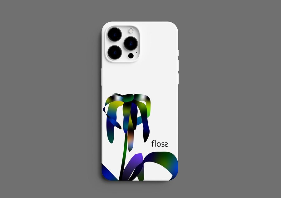 prompt: create a phone case for the flower shop of the brand ’FLOSS’. Make a phone case in a slightly dark green gradient color. Write ’FLOSS’ in a minimalistic sans-serif font on the case. The background is white.