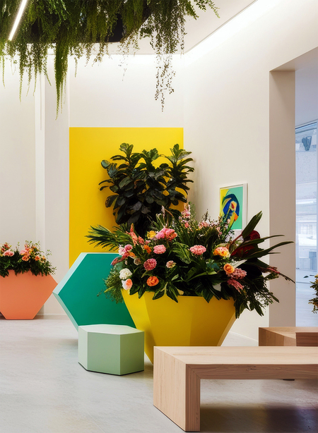 prompt: create a photo of a modern interior design for the FLOS Swapshop flower shop, a combination of simplicity and creativity. The airy room has a thoughtful selection of potted plants with elegant minimalistic planters in muted tones. The interior is in bright non-pastel shades: pale pink, green, yellow.