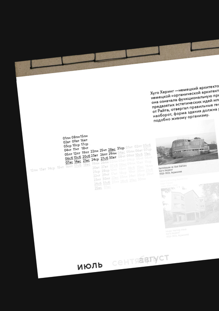 Крепление календаря — японский переплёт. Творчество Райта было связано с Японией: он бесконечно вдохновлялся ей, внедряя принципы оттуда в собственную архитектуру