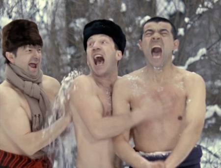 Хотя, если честно, водой облились только раз, специально для съёмки. Вот только фотограф, как уже не раз бывало, подкачал. Снял ни то, ни сё. Вёдра заслоняют друг друга. Воды почти не видать. Но повторять почему-то не стали…