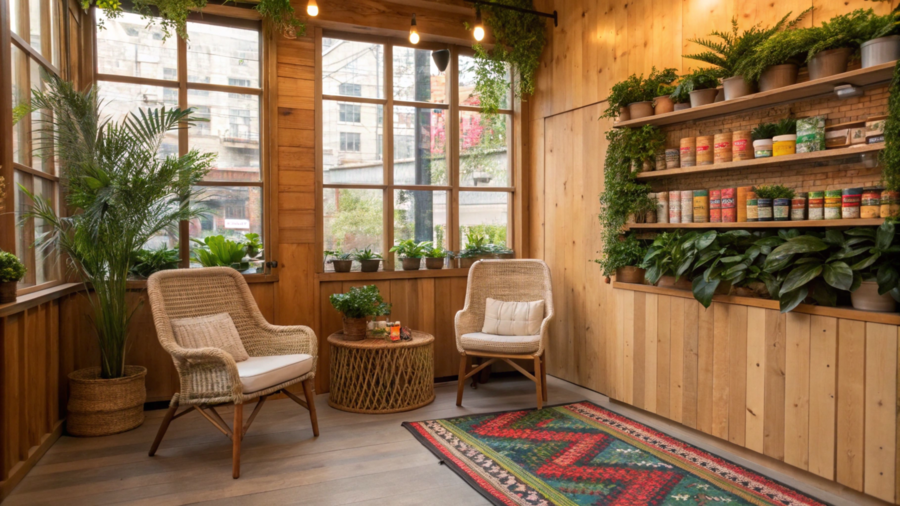 Промпт 2: a shop, wooden walls, plants all around and welcoming atmosphere. it has large windows with windowsills and plants on them. near the window there are two comfortable woven chairs
