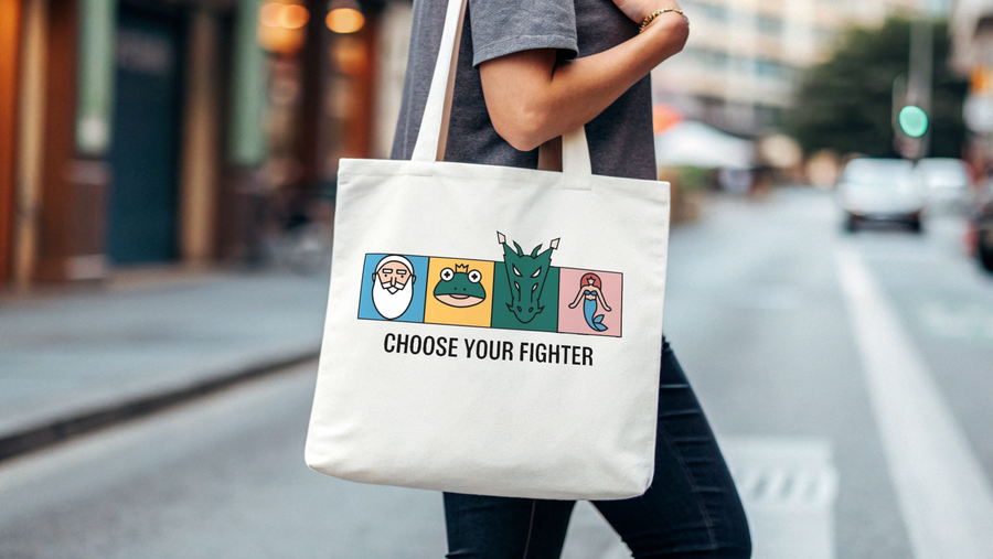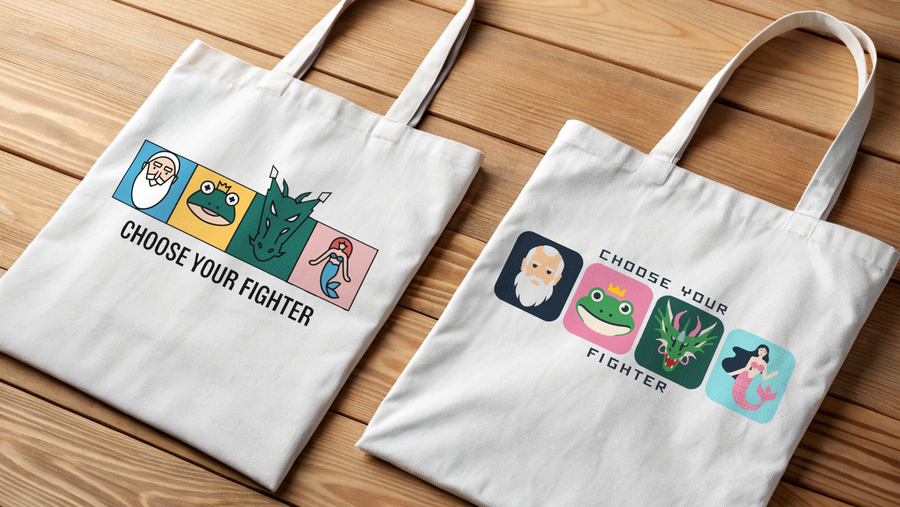 Промпт для изображения на сумке (Ideogram): 4 icons placed horizontally one after the other: a minimalistic cartoonish face of an old man with long white beard, a froggy face with a small crown, a three headed green dragon and a mermaid. on top of the icons, there’s a phrase saying «choose your fighter»