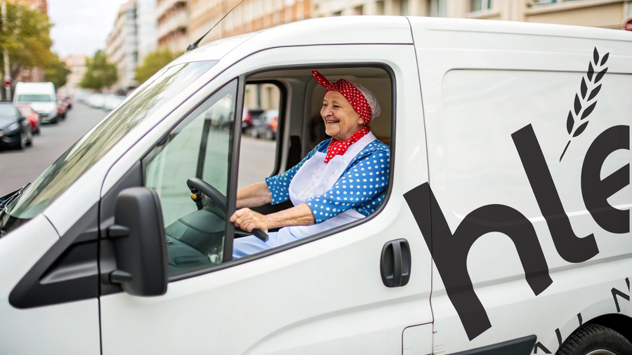 Промпт: a white van on the street. grandma in blue dress, a white apron and a red polka dot shawl is driving it.