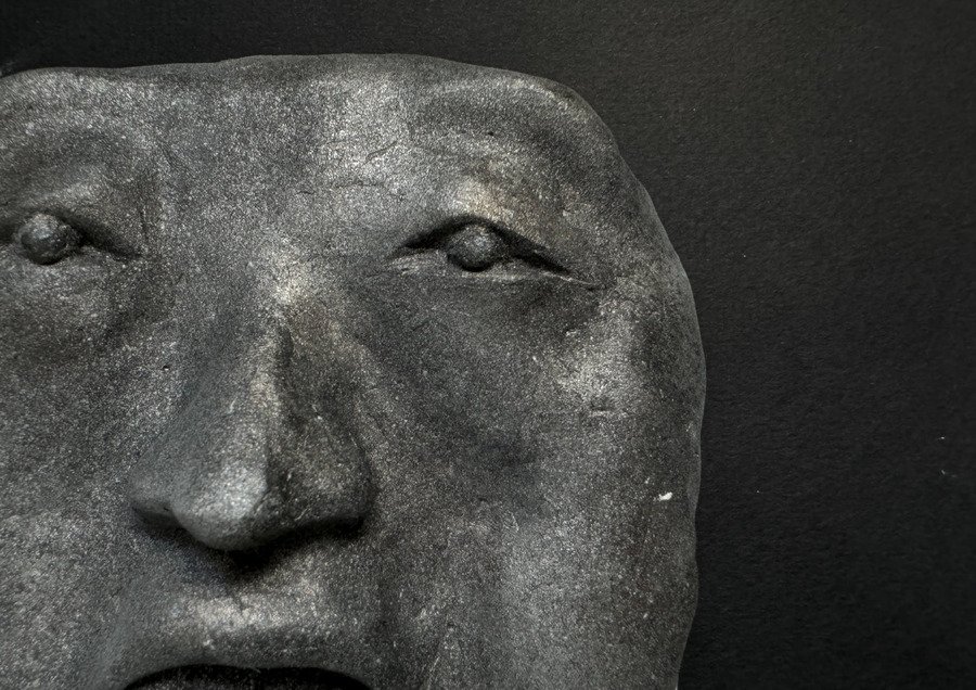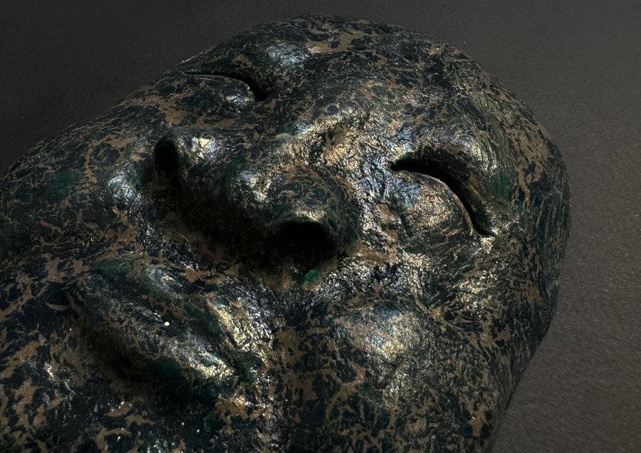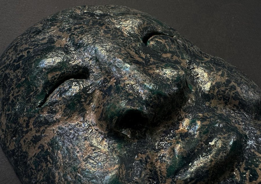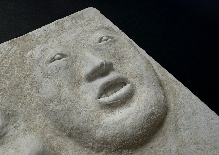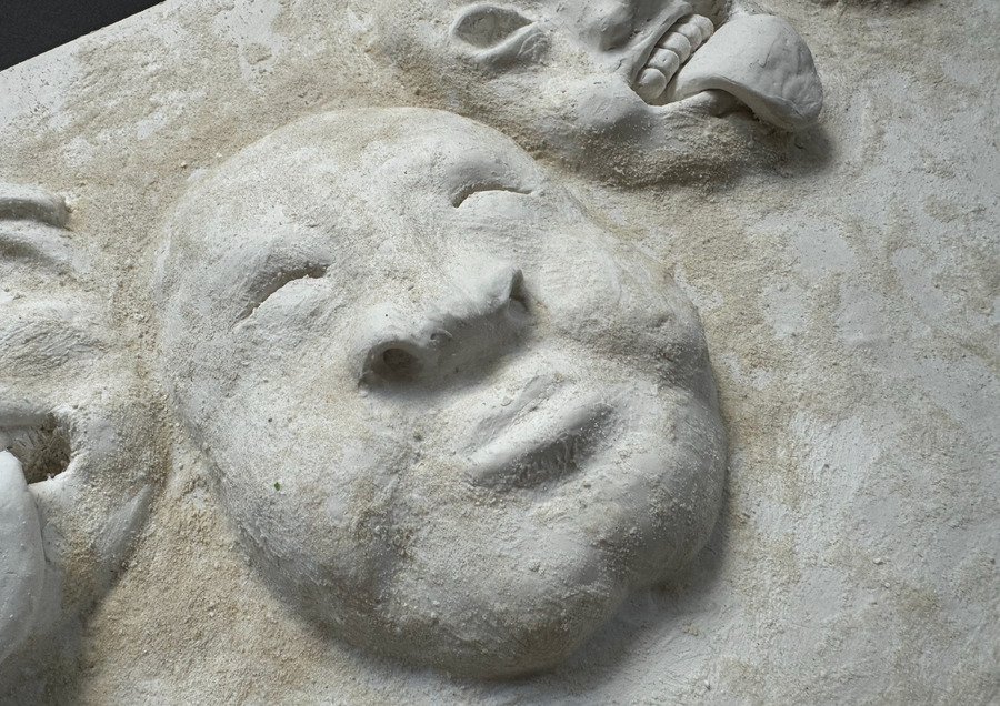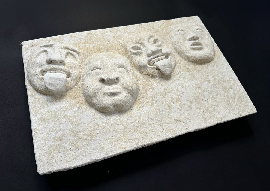 Мой проект представляет собой прямоугольную гипсовую форму с четырьмя масками, которые словно «выглядывают» из плоскости в объём. Текстурой и настроением этого объекта, мне хотелось передать традиции японского стиля ваби-саби — простоты и архаичности.
