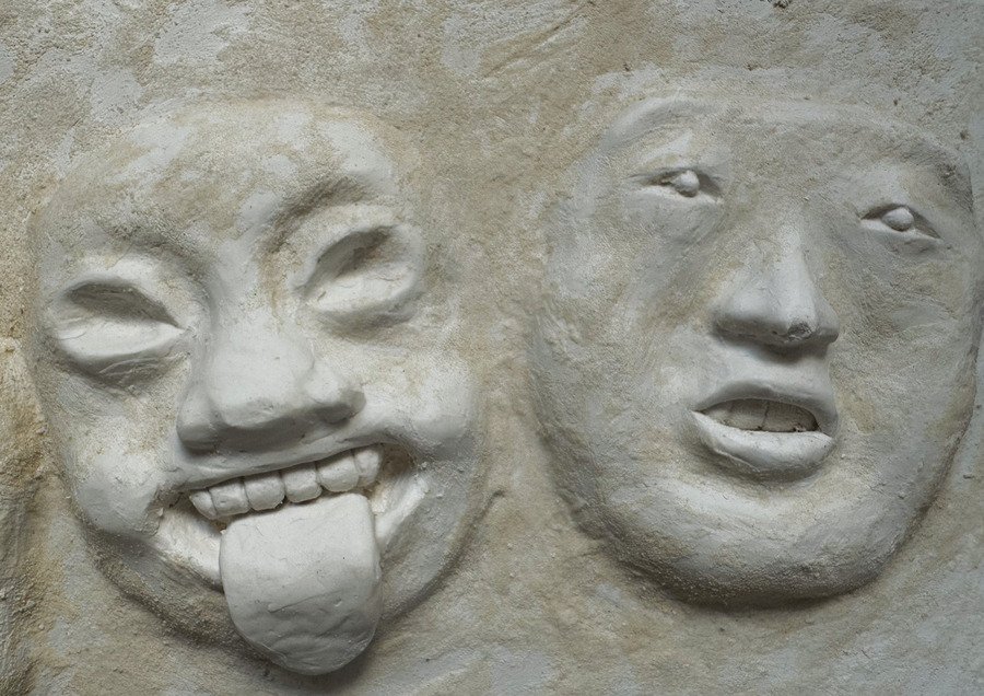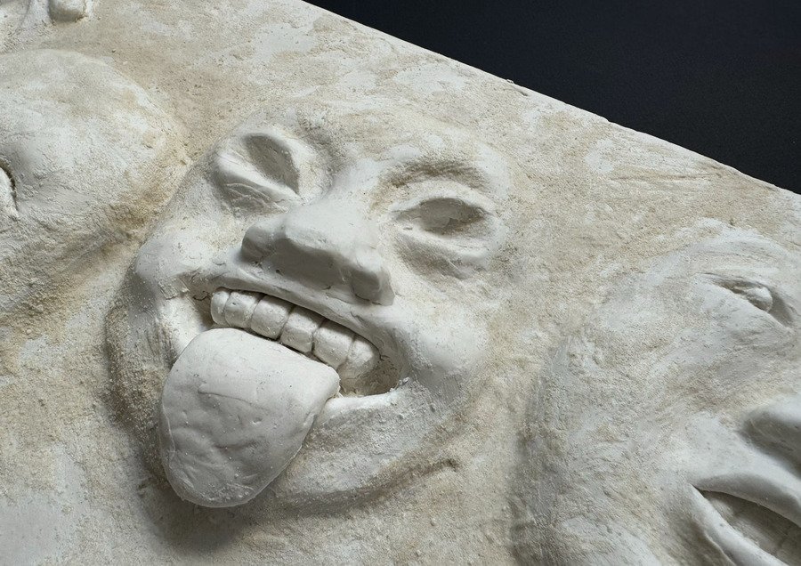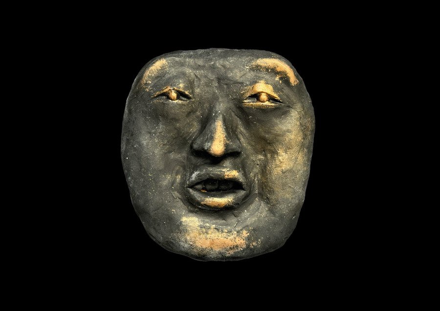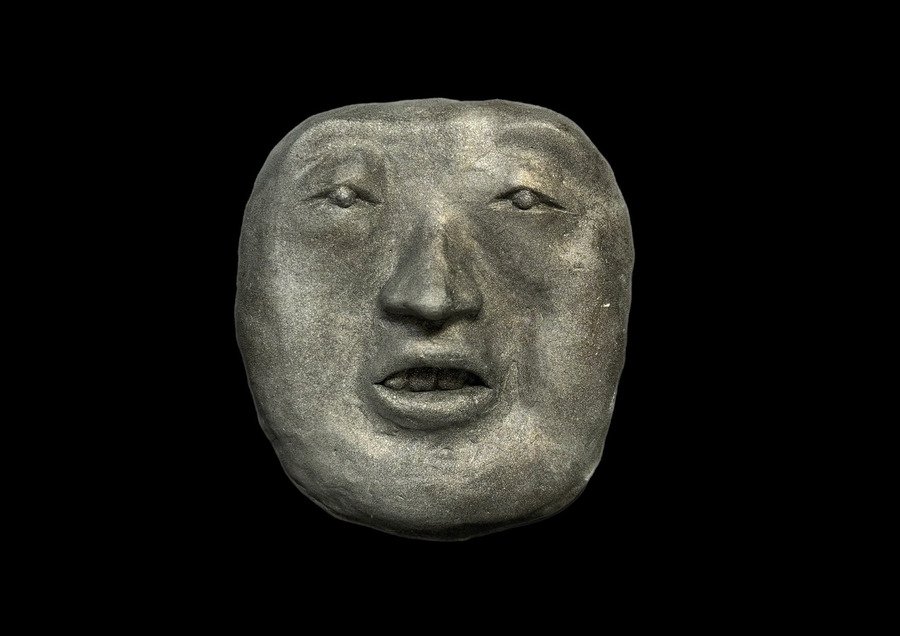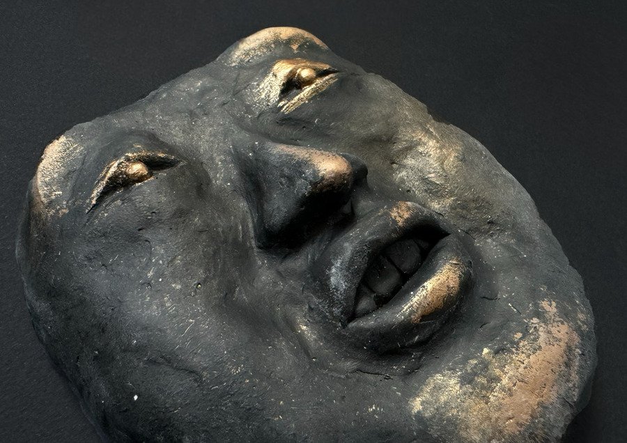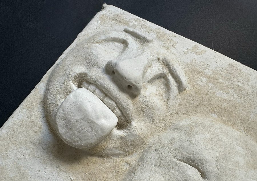 Мой проект представляет собой прямоугольную гипсовую форму с четырьмя масками, которые словно «выглядывают» из плоскости в объём. Текстурой и настроением этого объекта, мне хотелось передать традиции японского стиля ваби-саби — простоты и архаичности.