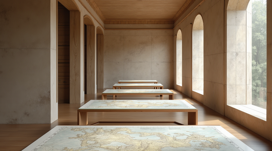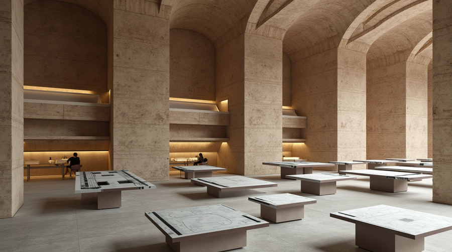 promt: Create an interior for a workspace in an architecture office with glass tables with maps and blueprints on them.