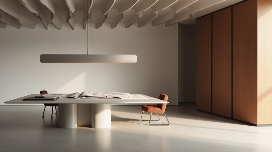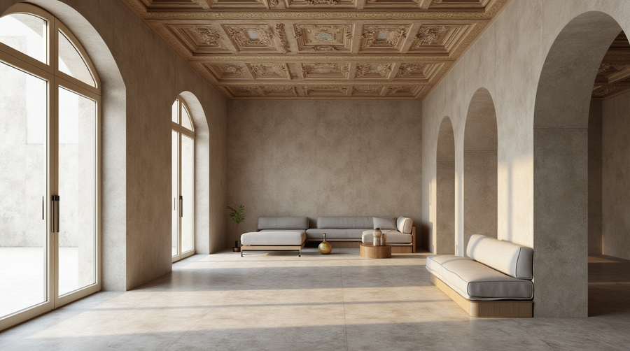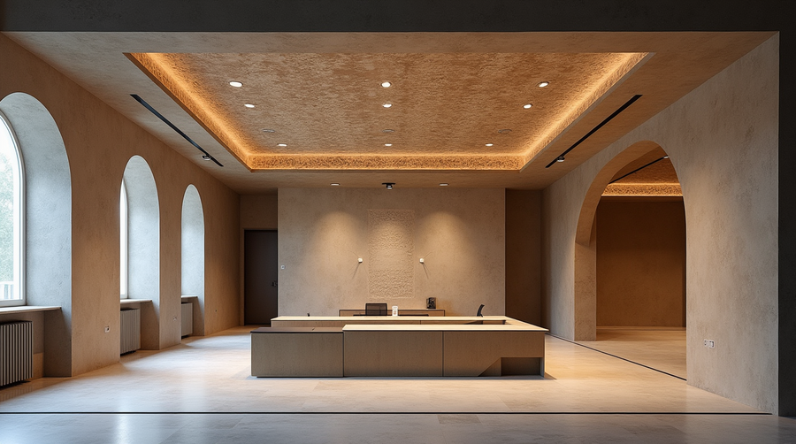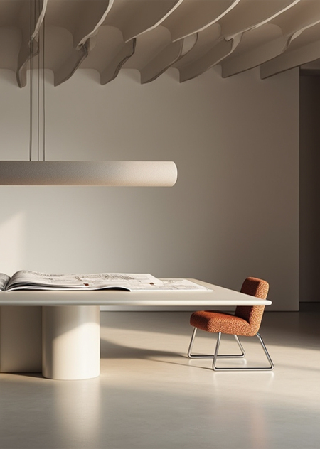 Promt: Create a workspace in an architectural office located in an old restored building. The interior should be minimalist, with walls and ceiling with elements of old moldings.