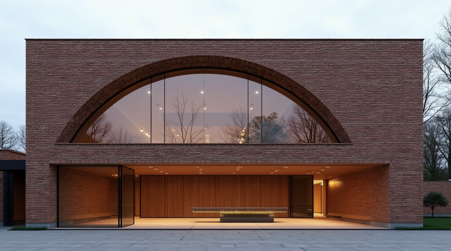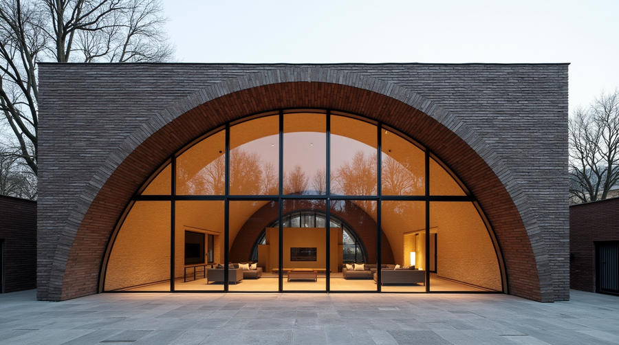 Promt: create a brick two-story building with large hemisphere-shaped windows.