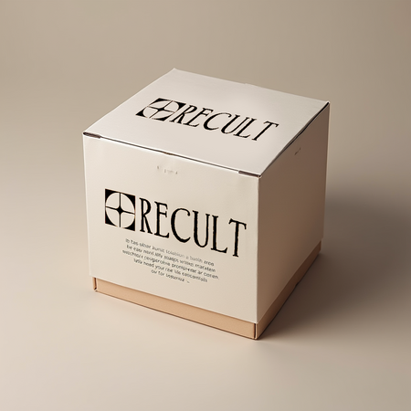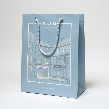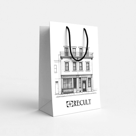 Promt: create a rectangular package of size a3 on which is written «RECULT» in a stretched font with serifs and on the rest of the space an illustration of an old house with thin lines. the package must be blue (bac8cd).