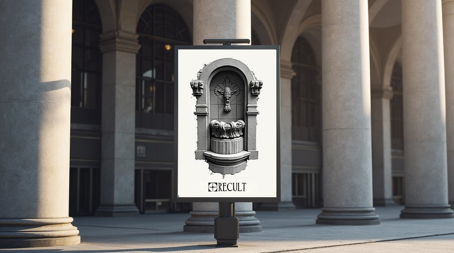 Promt: create a large realistic banner in an old Moscow building with a man walking past it. The banner should have a large image of the corner of the building along with the caption «Recult» and a little information at the bottom.