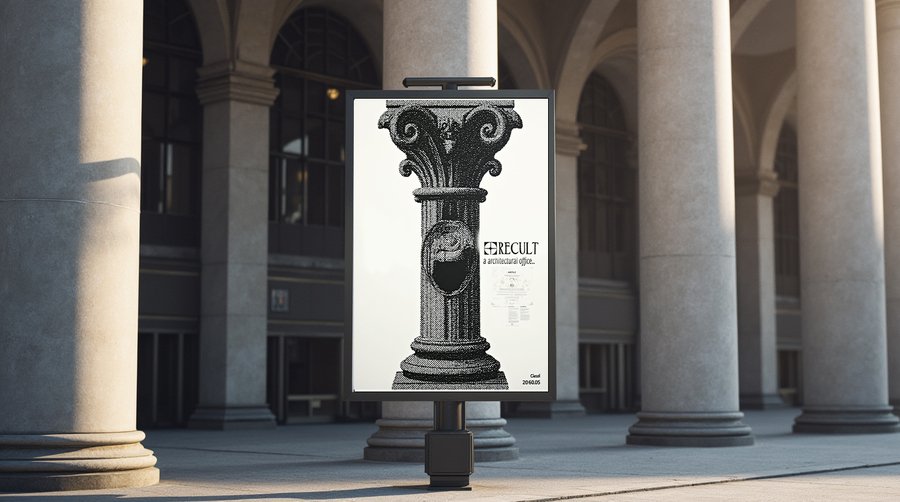 Promt: create a monochrome poster a4 in the center of which is a fragment of an ancient window with stucco and the words «RECULT — architectural office» in elongated round font with serifs.