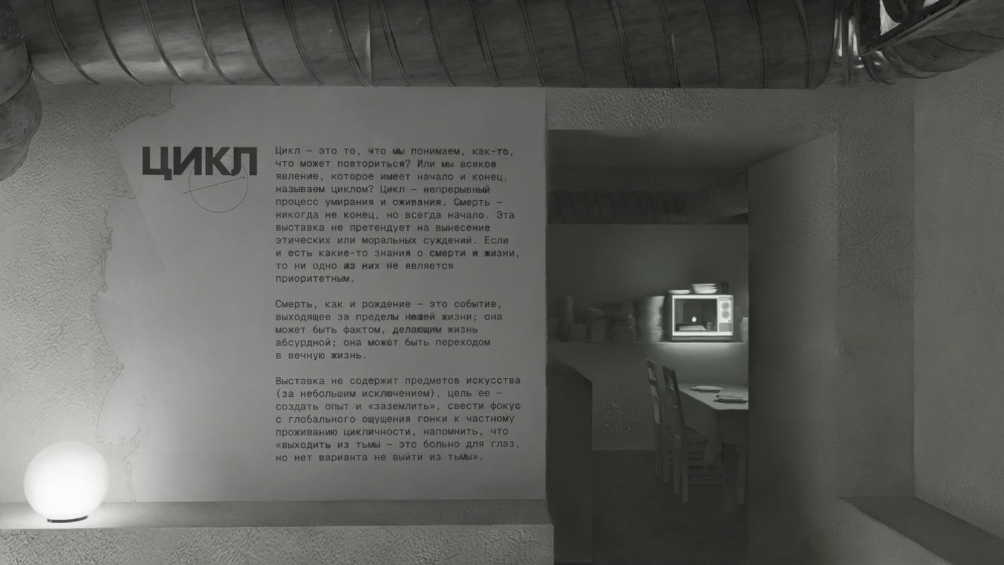 Цикл — непрерывный процесс умирания и оживания, где смерть — и конец, и начало. Выставка предполагает прохождение семи комнат, цель ее — создать уникальный опыт и напомнить, что все циклично.