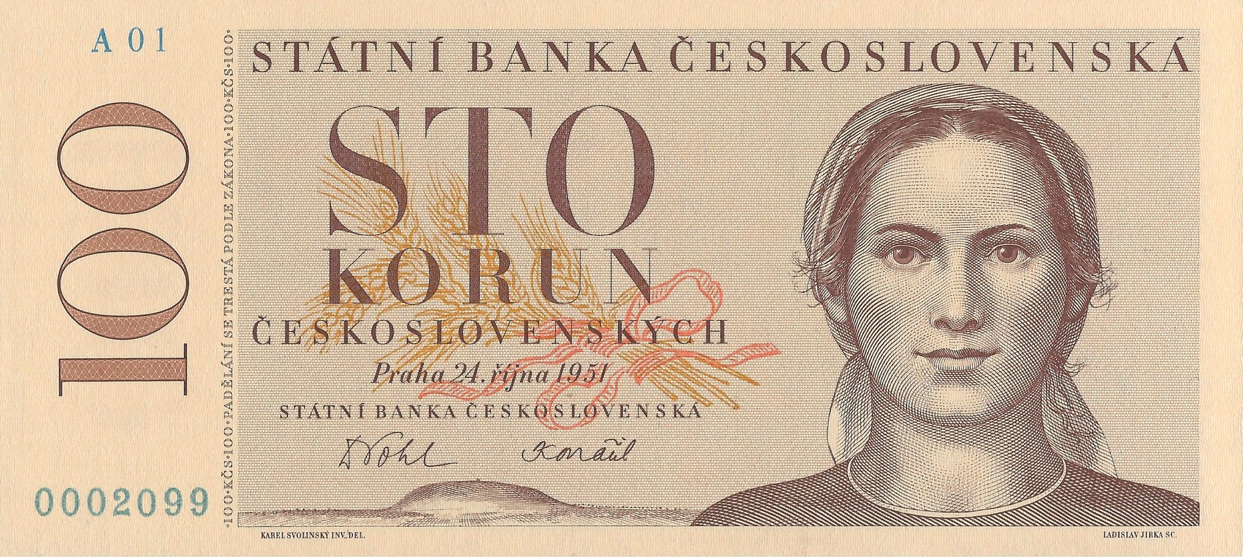 Купюра достоинством 100 крон была выпущена Государственным банком Чехословакии в 1951 году.