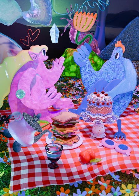 Фантазийные формы деревьев, светящиеся грибы и воздушные элементы создают атмосферу сновидения. Герои сидят на клетчатом пледе, угощаются десертами и фруктами, а в воздухе чувствуется нежность и трепет ожидания, словно сама природа замерла в предвкушении важного момента.