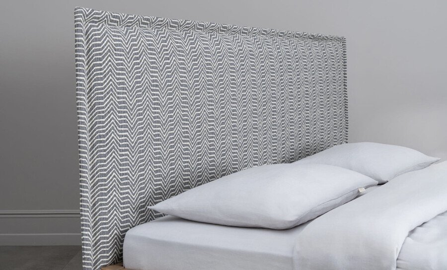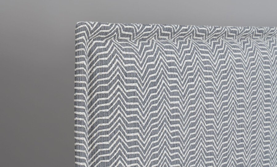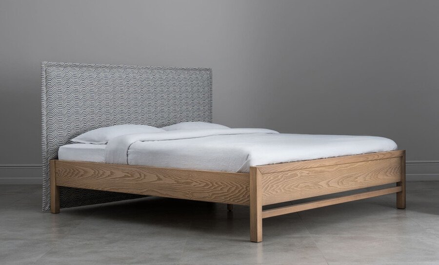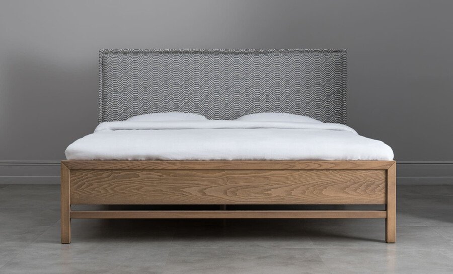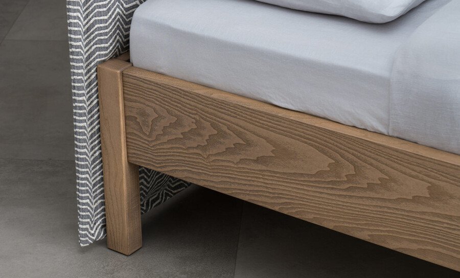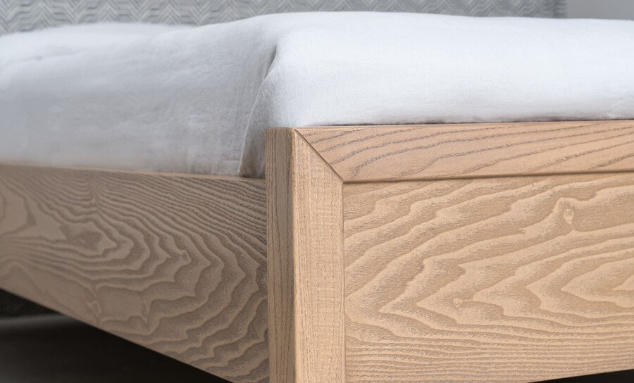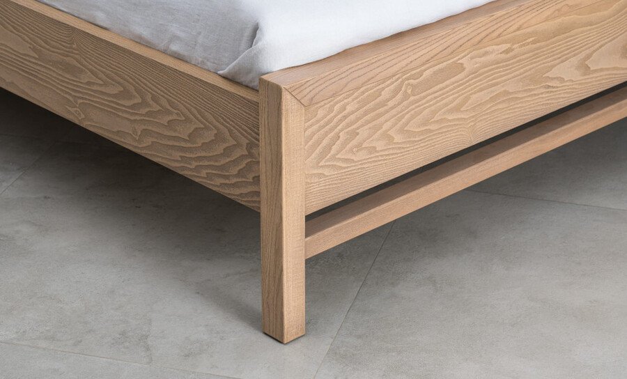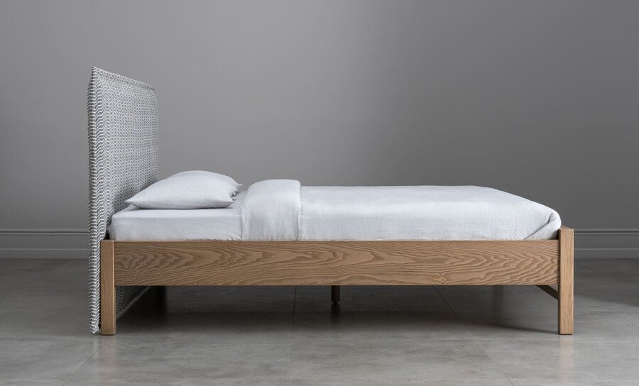 The design wanted to reflect the aesthetics of Scandinavian minimalism, functionality and homeliness. The bed seems weightless due to the thin high legs, and the headboard seems to float above the floor without any supports. This effect is enhanced by the contrast between the strict lines of the frame and the softness and airiness of the textile headboard with stitched free edges, which make the model more relaxed. Protruding slats give the simple shape of the base a delicate relief.