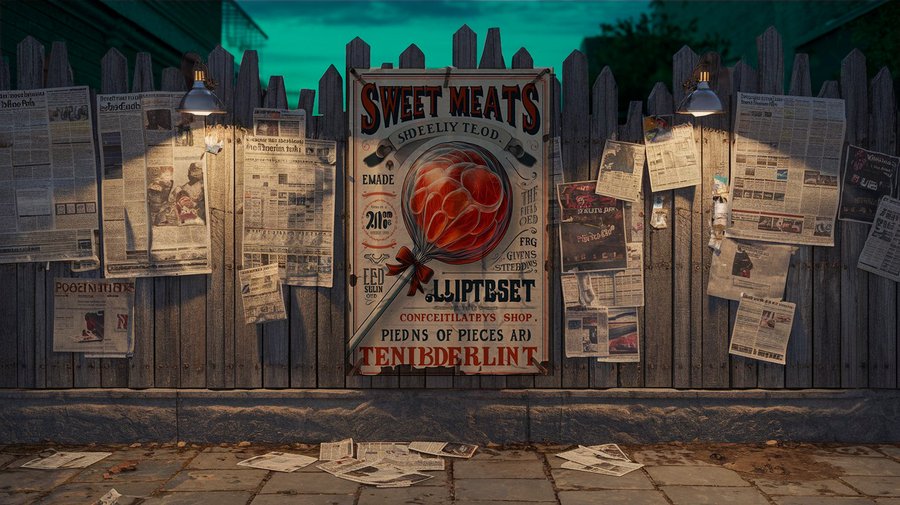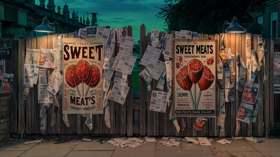 Рекламный постер кондитерской лавки «Sweet Meats», продающей леденцы в виде кусков прозрачного красно-оранжевой мясной вырезки. Стилизовано под рекламные постеры Англии времен 18-19 века. Шрифт изящный.