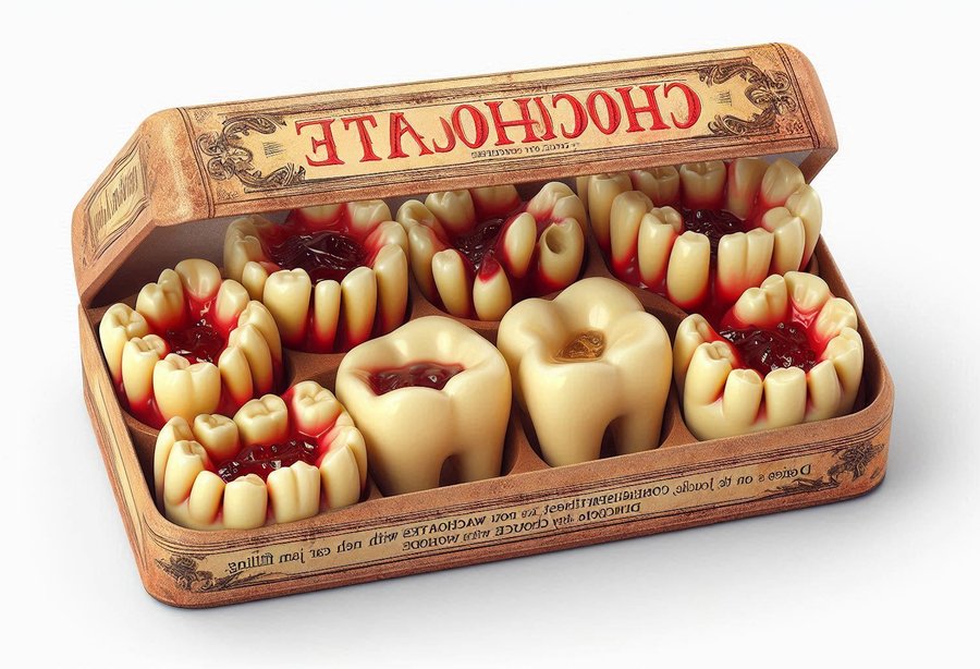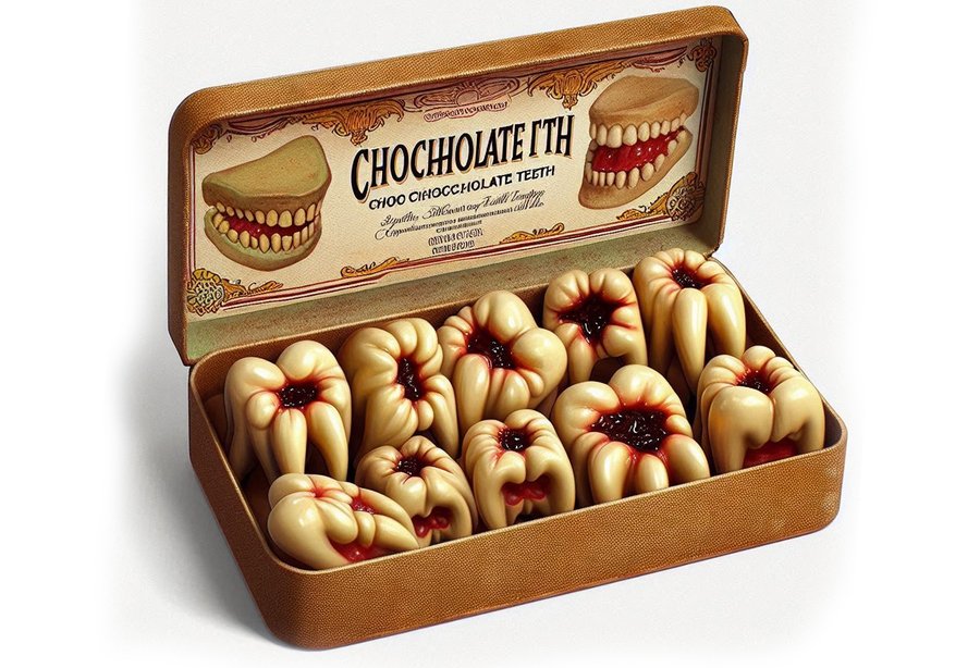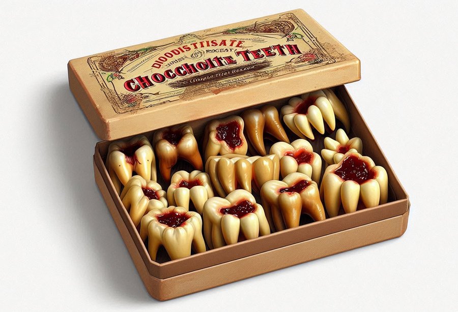 Box of chocholate teeth: beige on the outside and dark chocholate with red jam filling. They are disguistingly realistic, yellowish with caries and holes. Box is a bit shabby and its design is exquisite and victorian. Whole box should fit in the image