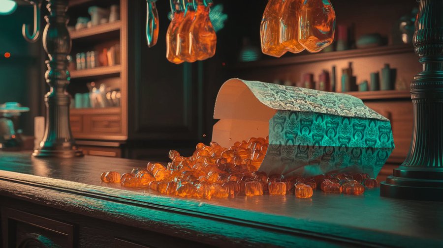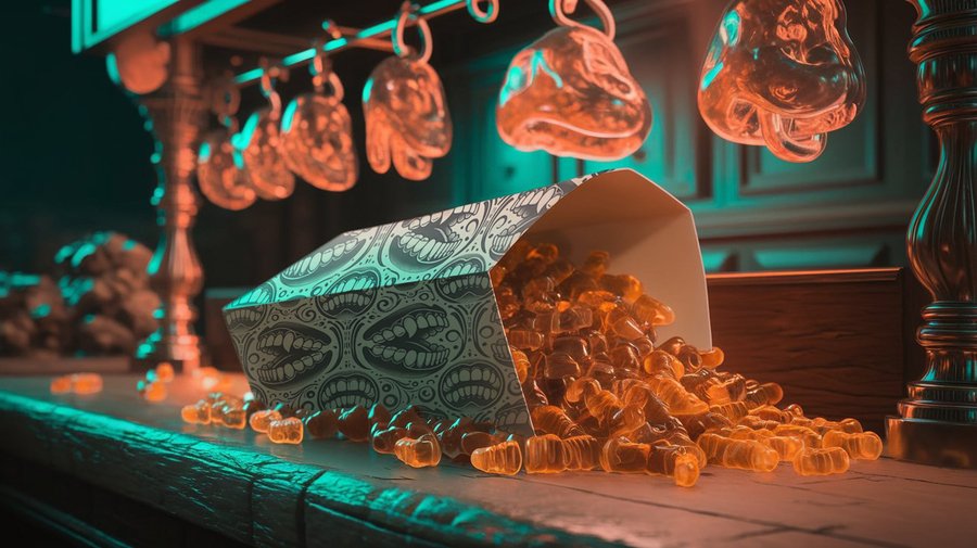 Mockup for blank white paper bags for candy, filled with tiny orange translusent teethl. Bag is lying in its side on a wooden counter, candy falling out of it. iIt 's all in an old victorian candy shop that sells candies shaped like teeth and orange translusent meat chunks hanging from butchers' hooks. Lighting is dim, partially orange, partially bluish green.