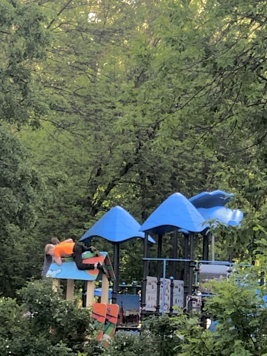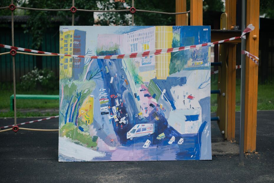 Я вспомнила место неподалеку от одной из квартир, где когда-то жила. Это детская площадка. Она отличалась от большинства площадок тем, что горки и качели там стояли не на резиновом покрытии или вытоптанной земле, а прямо на траве. Я приходила в это место послушать, как мимо проезжают поезда, и подумать. Образ детской площадки в работах — сублимат детства или пространство спокойствия, которого порой так не хватает.