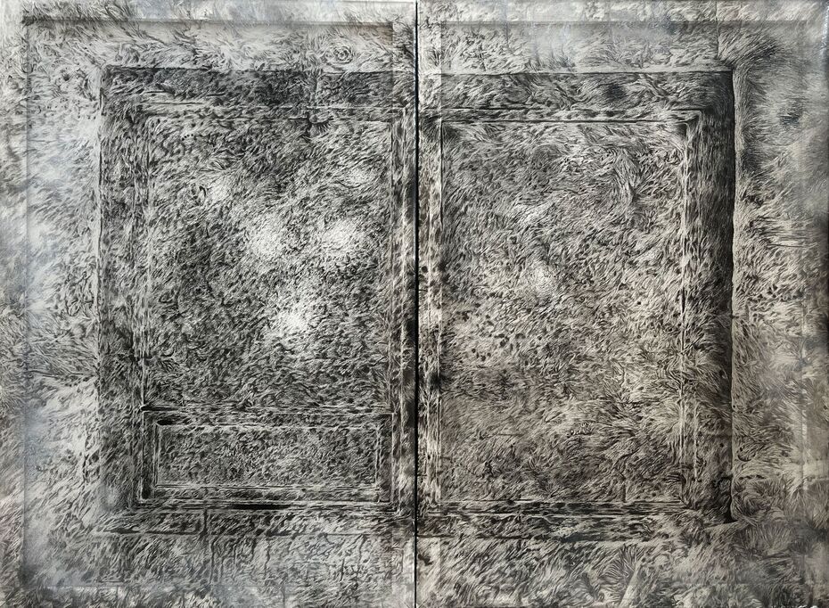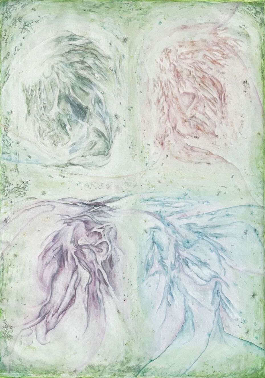 Также будет представлен один живописный холст untitled’1 — в каком-то смысле экспериментальный. Когда я его делала, у меня на проклейке, самом нижнем слое, образовались трещины, и я взяла этот артефакт материи за основу. Мне нравится, когда в работе присутствует элемент чужой воли, сопротивление материала, который выходит на передний план и становится канвой визуального образа.
