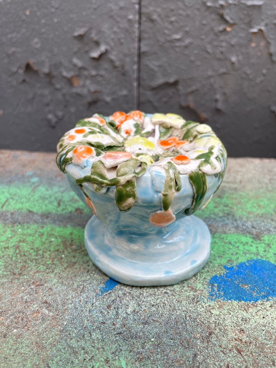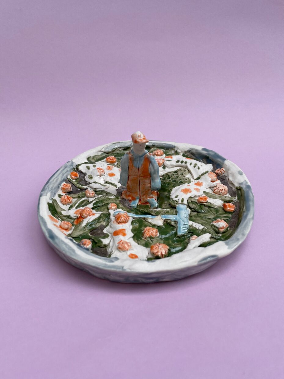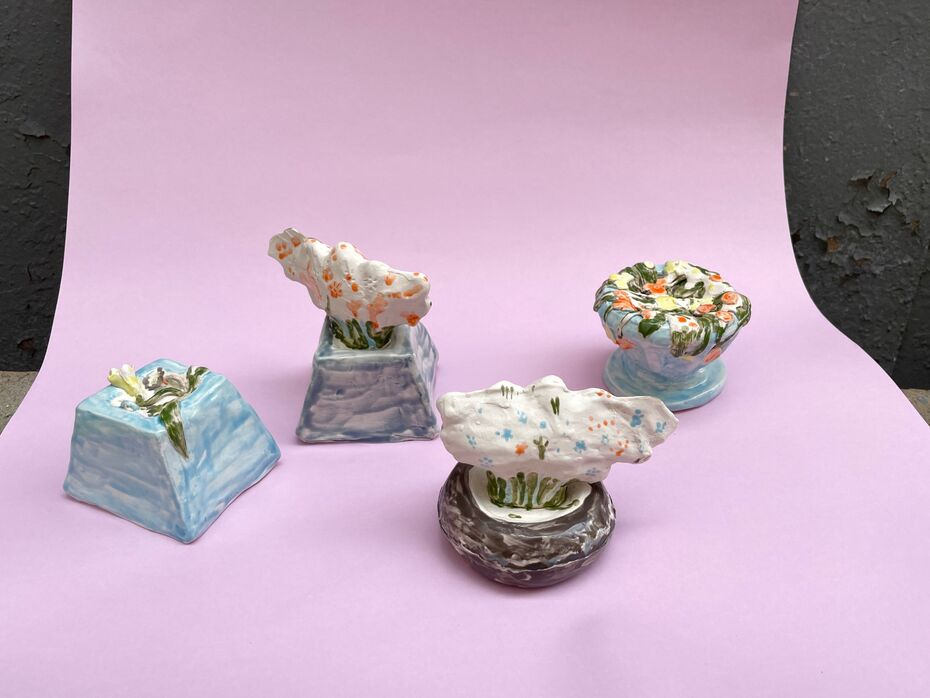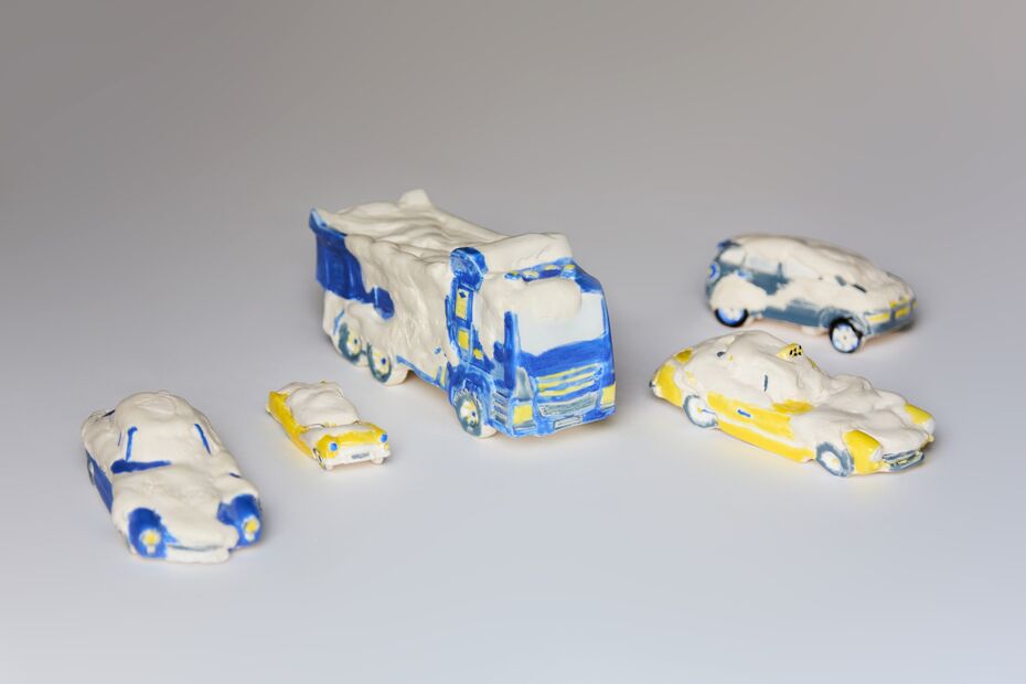 Часть серии, представленной мною на ярмарке, составляют работы, которые я сделала в 2020 году: фарфоровые машины в снегу. Этим летом я дополнила серию керамикой и клумбами из фарфора. Также я покажу четыре новые живописные работы.