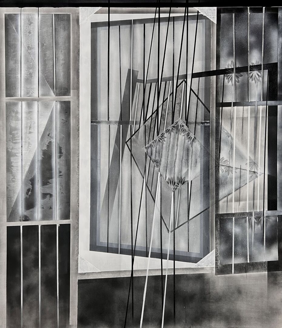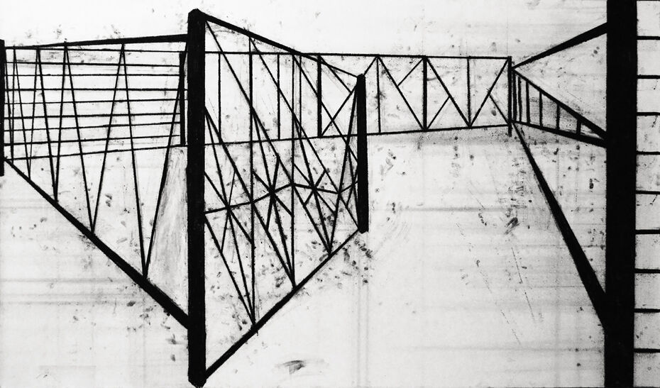 Я представляю серию графики back side of the spaces. Работы варьируются по размерам и форме, но основным является то, что они сделаны в два слоя. Нижний слой — это графика карандашом на бумаге или кальке, а верхний — прозрачная плёнка и краска, которую я соскребаю с поверхности. Образ возникает путём добавления и удаления материала с разных слоев, которые в итоге соединяются. Это двустороннее движение к образу, точке пересечения, является методом серии. Переменными становятся мотивы: я обращаюсь и к городским задворкам, и к чему-то более символическому, снам-размышлениям о специфике пространств и восприятия, а также к другой своей работе — виртуальной реальности. Я бы сказала, что образы серии суть расщеплённые пространства, подвижные фактуры, лишённые углов, застревающие между фигуративным и абстрактным, объёмным и плоскостным, между узнаванием и ощущением.